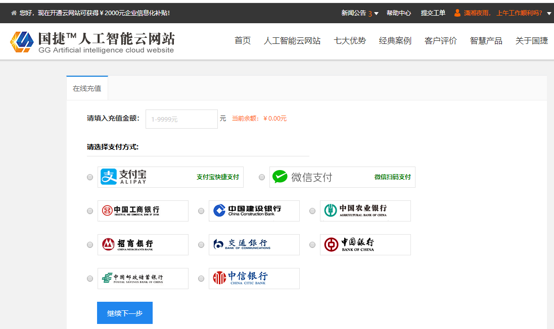 2、点击在线充值,,填写您需要的充值金额,及支付方式,填写之后继续下一步,跳到支付界面,完成支付即可;