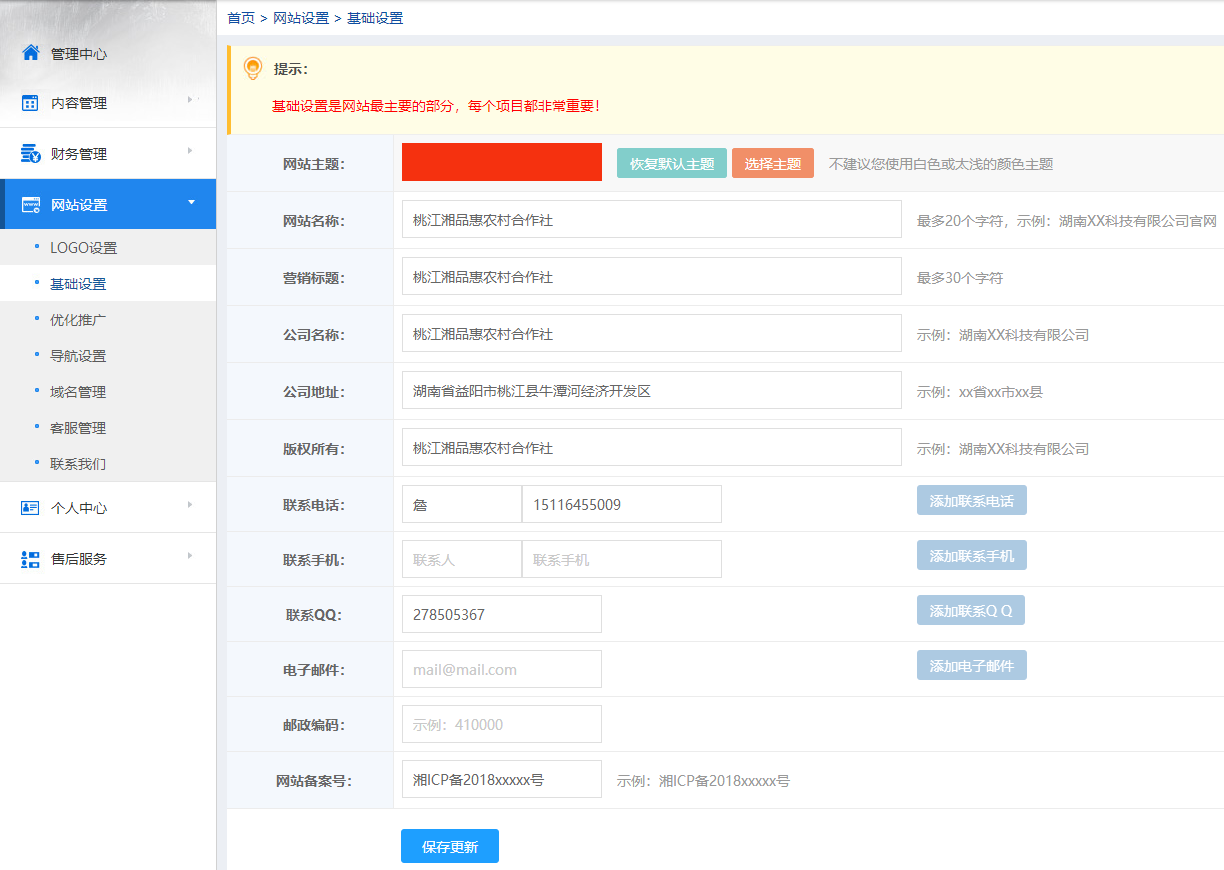 包括联系我们页面的联系方式,地址都是在这里设置。